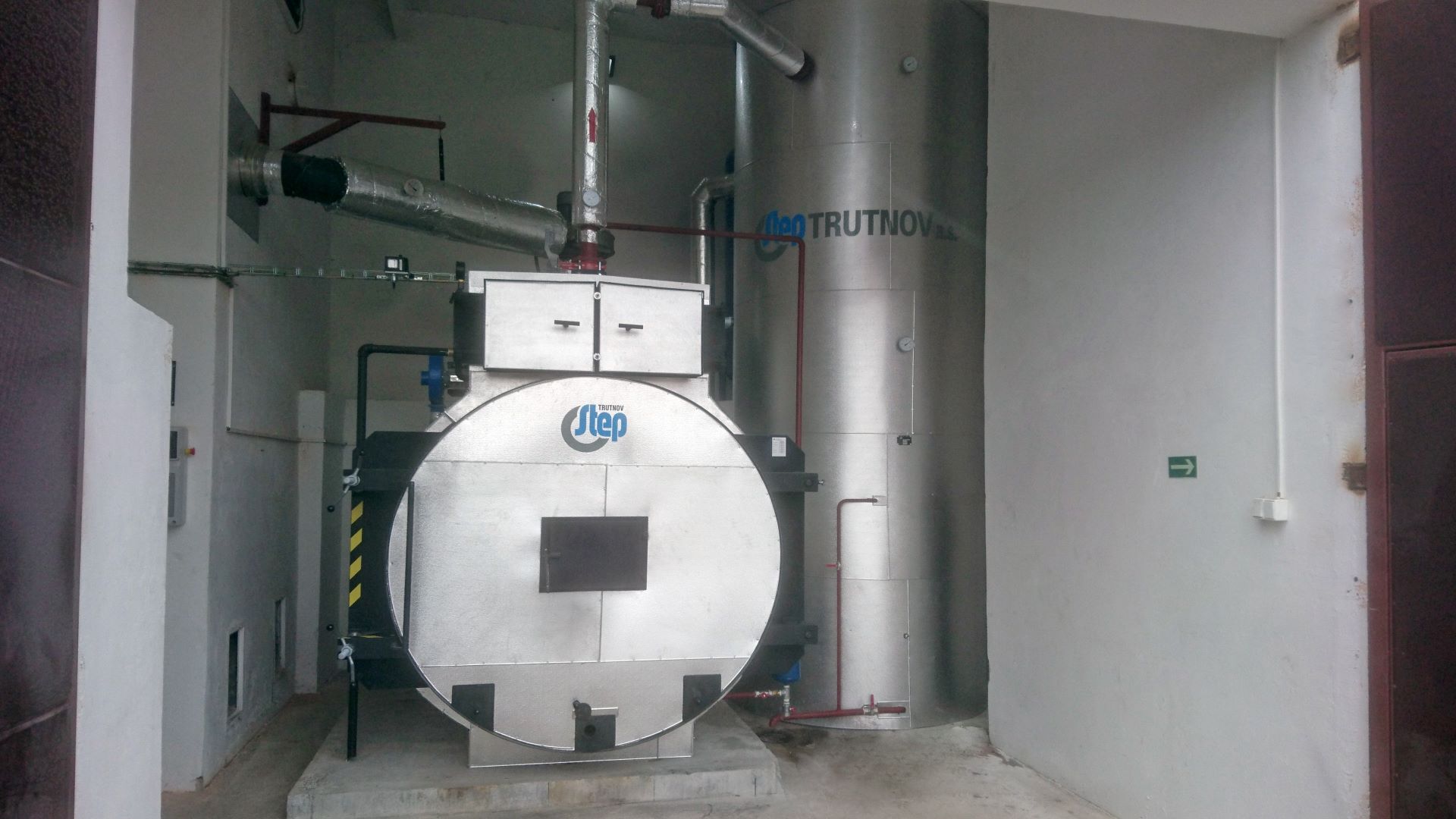 Kotel o výkonu 190 kW na spalování celých balíků řepkové nebo pšeničné slámy pro vytápění hal a přilehlých prostor.