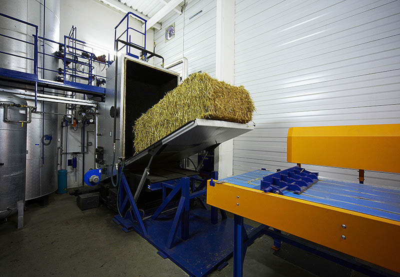 Kesselanlage für Verbrennung von ganzen Strohbällen und energetischen Pflanzen mit einer Leistung von 175 ÷600 kW einschließlich der Warmwasserleitung.