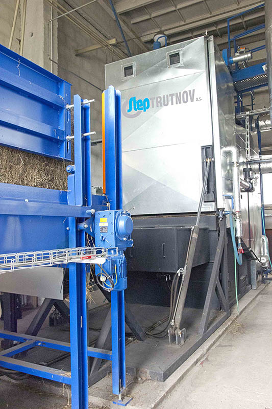 Kessel für Verbrennung von ganzen quaderförmigen Strohballen. Leistung 800 MW. Für die Beheizung von Büros und anderen Gebäuden.