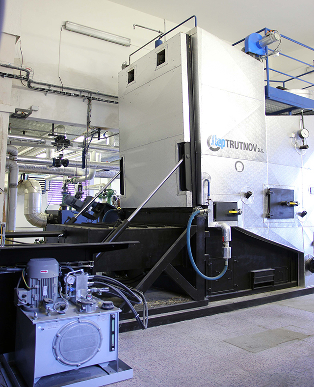 Teplovodný kotol o výkone 190 kW na spaľovanie celých balíkov slamy pre vykurovanie kancelárie, prevádzkových objektov družstvá, MŠ a ZŠ.