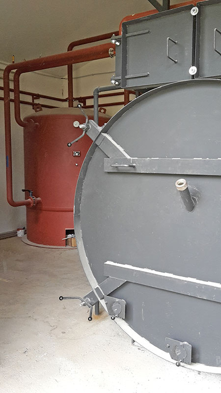 Kotolňa o výkone 190 kW na spaľovanie celých okrúhlych balíkov slamy pre vykurovanie hotela a reštaurácie.
