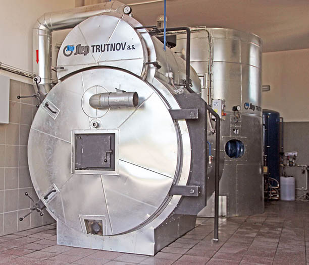 Poľnohospodársky podnik Keply Kotol o výkone 190 kW na spaľovanie okrúhlych balíkov slamy pre vykurovanie poľnohospodárskeho podniku.
